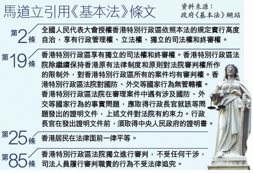 马随即主动引用《基本法》条文,解释香港有司法独立及没有人在法律面前有特权,「第一就系司法独立,司法独立喺《基本法》里面系规定慨,请大家睇第2条、第19条同第85条,第二,系《基本法》第25条,呢度规定系人人喺法律面前系平等」。