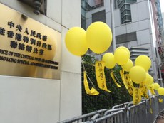 游行结束后,人们把黄色气球系在了中联办外的铁闸上方。