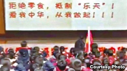 在韩国乐天集团2月底同意为萨德反导系统部署换地之后,中国各地有民众在官媒和共青团网媒的鼓励下,发起抵制乐天及韩国的各类行动。星期三网上流出的一段视频显示,一所小学几百学生在老师带领下,发誓“拒绝零食、抵制乐天”,作为“从我做起”的爱国宣传教育。