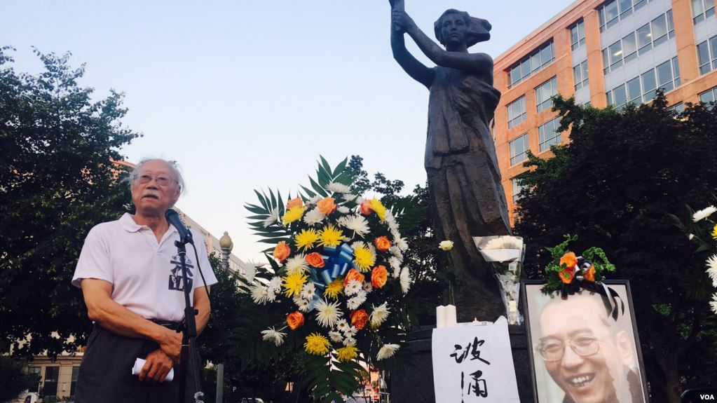 星期四晚间,一些民主人士在美国首都华盛顿的中国大使馆门前集会,纪念因肝癌逝世的诺贝尔和平奖得主刘晓波。