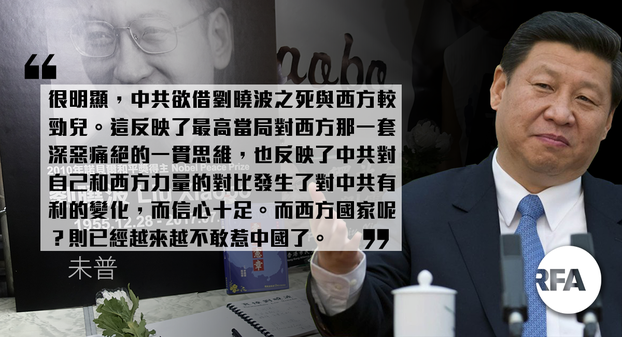 很明显,中共欲借刘晓波之死与西方较劲。这反映了最高当局对西方那一套深恶痛绝的一贯思维,也反映了中共对自己和西方力量的对比发生了对中共有利的变化,而信心十足。而西方国家呢?则已经越来越不敢惹中国了。这在自由世界中,是一个非常糟糕的发展趋势。对此,西方一些有识之人已有所认知。《经济学人》说,随著90年代中期中国经济迅速发展,西方国家已经惹不起中国了。《泰晤士报》说,刘晓波之死是在提醒世人,在中国标榜自己是一个自由的、讲道德的国家之前这个国家还有很长的路要走。而现在这个政权甚至对走上这条道路都根本不感兴趣。