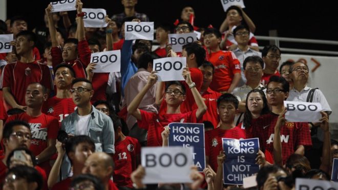 - 香港球迷嘘国歌——近年中港矛盾升温,足球赛事亦成为爆发点。近年中国队与香港队的足球大战中,香港球迷亦狂嘘国歌,举起“香港不是中国”的标语。香港足球总会更曾因球迷嘘国歌而被罚款。
