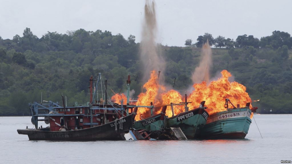 印度尼西亚和马来西亚摧毁在它们海岸附近捕鱼的外国渔船,以提醒外国人这两个国家在船只往来众多的有争议的南中国海它们有自己的主权声索。这两个国家在那一海域的主权声索常常被其他国家忽视。