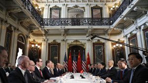 美中双方代表团2019年2月21日在白宫艾森豪威尔行政楼举行贸易谈判。