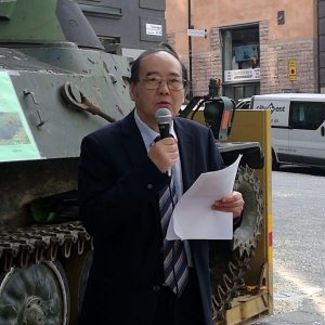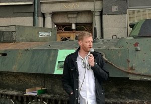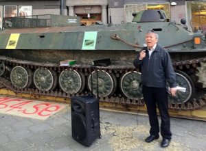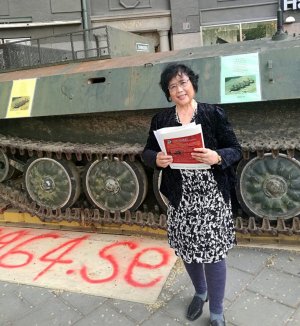 (独立中文笔会2019年6月4日斯德哥尔摩讯)6月3日晚到5日上午,瑞典支持六四运动联合会在斯德哥尔摩市中心北向的主道——斯维亚大街(Sveavägen)45号门口空地上展示了一辆旧装甲车,车身四周张贴了“勿忘六四”为主题的中瑞英等十种文字和著名的“坦克人”照片。