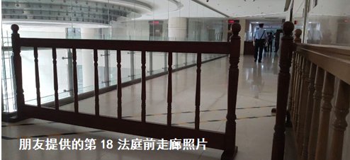 6月25日我他约了媒体朋友去旁听庭审。在大门外公告牌上看了半天,没有发现张案信息。9点多一点进入三层,发现第十八法庭还没开,就用手机随手拍了几张照片。后来被告知该案是不公开审理,不能旁听。因看到有可能是张玉珍代理律师的两位女士走过来,就拍了张照片。那女律师看到拍照,说拍了她的脸,要求删掉。后来我让她看了,她看照片模糊,就说不用删了。但法警过来干预要我把手机给他们,删掉所有在法院内拍的照片。我问他们不让拍照的法律依据是什么,因为法庭外面的走廊通道是公共空间,为什么不能拍照。三个法警中的小头目说:在法院内,未经法官允许,都不能拍照,我的话就是法律。并气势汹汹地问我能不能配合(把手机给他们删除照片)?我没答复。小头目就命令另两个法警,把我反剪双手,从三楼一直押出大楼,到另一座楼的一个警务室,关上门,逼迫将手机交给他们,将进入法院院内的所有照片全部删了。被两个法警像押犯人一样反剪双手押着去警务室,这在我是平生第一次,想起来很耻辱,便咨询律师如何据法提出抗议。律师说:法律方面有明确规定的就是庭审时和在诉讼服务中心(立案庭)不能拍照,其他地点并无不许拍照的明确规定,禁止拍照的是特定场所、对象和内容,而不是法院内任何区域。但是律师又说:你在法院的屋檐下,禁止了你能怎么?