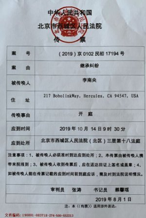 8月24日从女儿家回到湾区自己的家,翌日中午,掐着美国联邦快递营业部周日开门的点儿,取回存放在那里的旧金山中领馆8月13日发出的快件。本以为会是7月25日二次开庭的判决结果,打开一看,却是通知我10月14日上午9:30出庭的传票。(附件一)