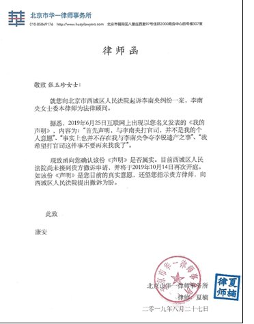 就10月14日的开庭,我的法律顾问夏律师给张玉珍发了一封信,信中说:“如该份《声明》是您目前的真实意愿,还望您指示贵方律师,向西城区人民法院提出撤诉为盼。”(附件二)