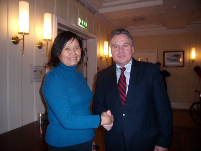 杰莉(左)感谢众议员克里斯托弗·史密斯赞成众议院第1717号决议-祝贺被监禁的刘晓波获得2010年诺贝尔和平奖。