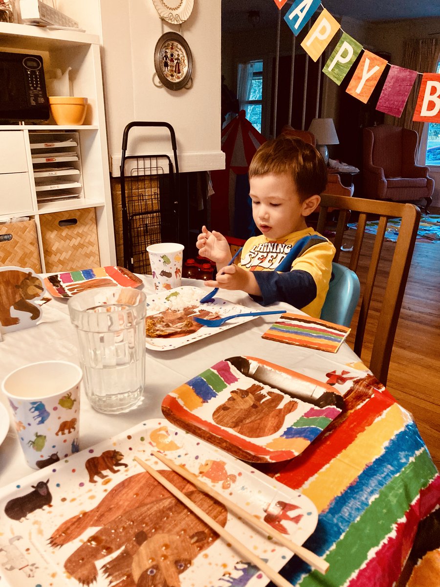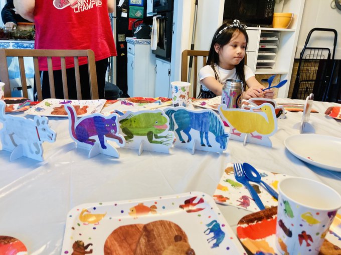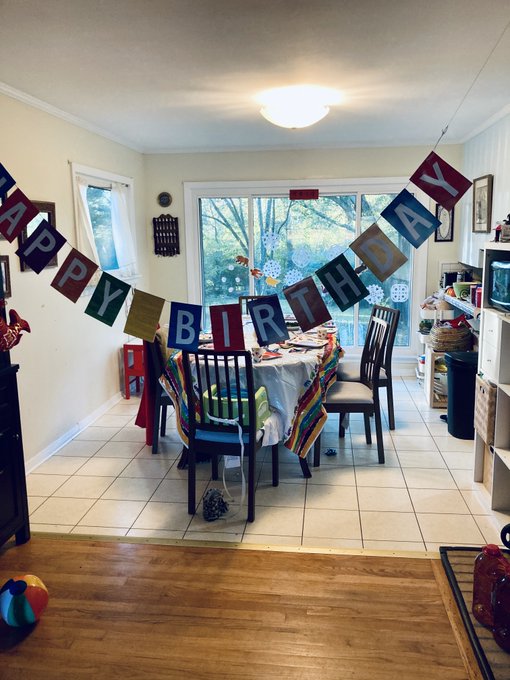 姐姐忙碌了一天,为弟弟布置生日聚会的会场。爸爸还到小镇唯一的中国餐馆去定菜,使我们吃到不地道的中国餐。