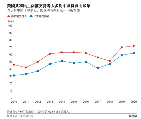 美国共和民主两党支持者大多对中国持负面印象. 表示对中国「印象差」的受访者数目近年不断增加. 调查在今年6至7月进行,共访问了1003名成年美国人。.